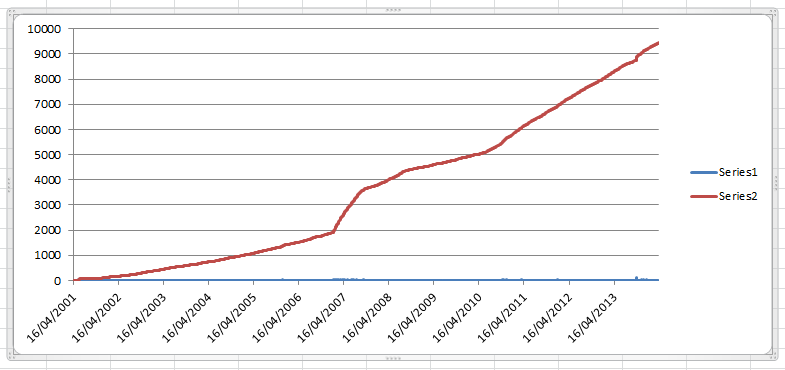This chart needs a little explanation. There are 1480 people without a start date. This reflects a period between 2006 and 2008 when the person-record creation date was not being logged. That's why you have the flat line during that period. So the chart should start in the lower left at '0', and should reflect a gain of 1480 new subscriptions during that flat period.